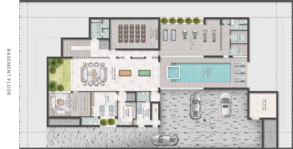 • Swimming Pool (≈500 sqft) with Deck + Lounge (≈400 sqft): Indoor aquatic escape.