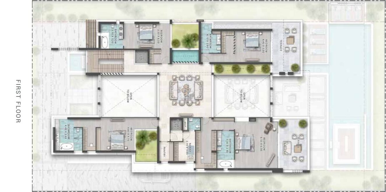 Bedrooms 2–4 (≈330–350 sqft each): All en-suite with dressing and terrace access.